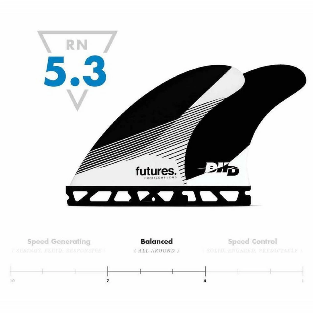 Die DHD-Finne ist eine mittelgrosse Honeycomb Template mit einer Balanced Ride Number von 5.3. Diese Template hat mehr Rake und bietet dem Surfer mehr Halt und Drive in seinen Turns.