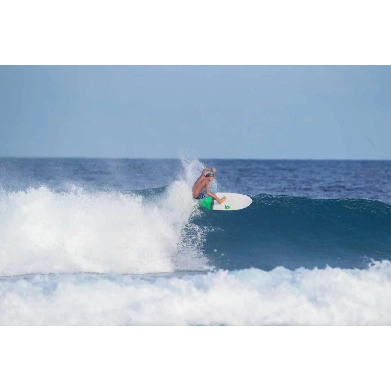 Die ausbalancierte Outline läuft aus der vollen Nose und der breiten Mid-Section in ein Swallowtail. Das Unterwasserschiff geht von einer Single- in eine Doppelkonkave über und die Nose ist leicht aufgestellt. Feingetuned wird das Ganze über die Tri-Quad Finoption. Gleiten, heizen, carven – Alles in Einem.